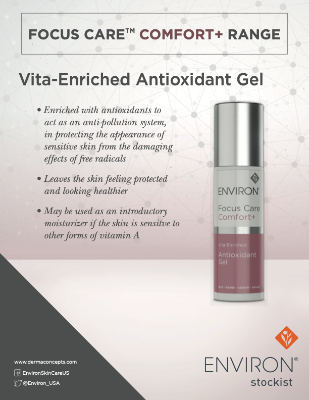 - Pre-cleanse, cleanse and tone with your preferred Environ products. Apply Antioxidant Gel evenly to the face, neck and décolleté or any areas of sensitivity before moisturising with your regular vitamin A enriched Environ moisturiser. Use morning and/or evening.