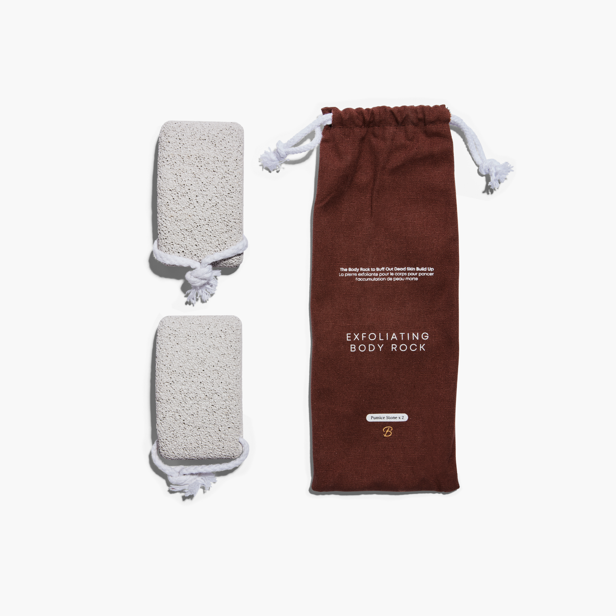 A 100% natural and reusable pumice stone made to buff away dead skin found anywhere on the body. This exfoliating body rock should only be used as needed in problem areas where skin needs to restore natural tone and texture. The reusable storage bag includes two body rocks. Benefits: * Remove dead skin cells * Make skin look visibly younger  * Improve skins natural tone and texture * Improve the look of rough, bumpy skin * Reduce ingrown hairs and razor burn via exfoliation Suggested Usage: For best results, soak your skin in the shower before using the exfoliating rock. We also recommend you wet the stone before use. Move the wet pumice stone in circular motions with light pressure over the skin, concentrating on the problem areas with uneven skin texture.
