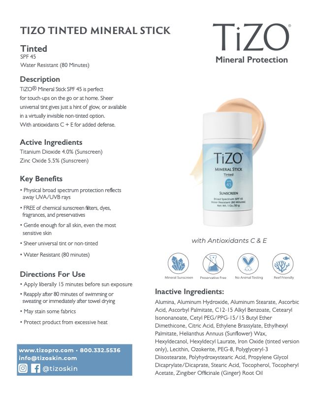 TiZO® Mineral Stick Tinted SPF 45 is perfect for touch-ups on the go or at home. Sheer universal tint gives just a hint of glow With antioxidants C + E for added defense.