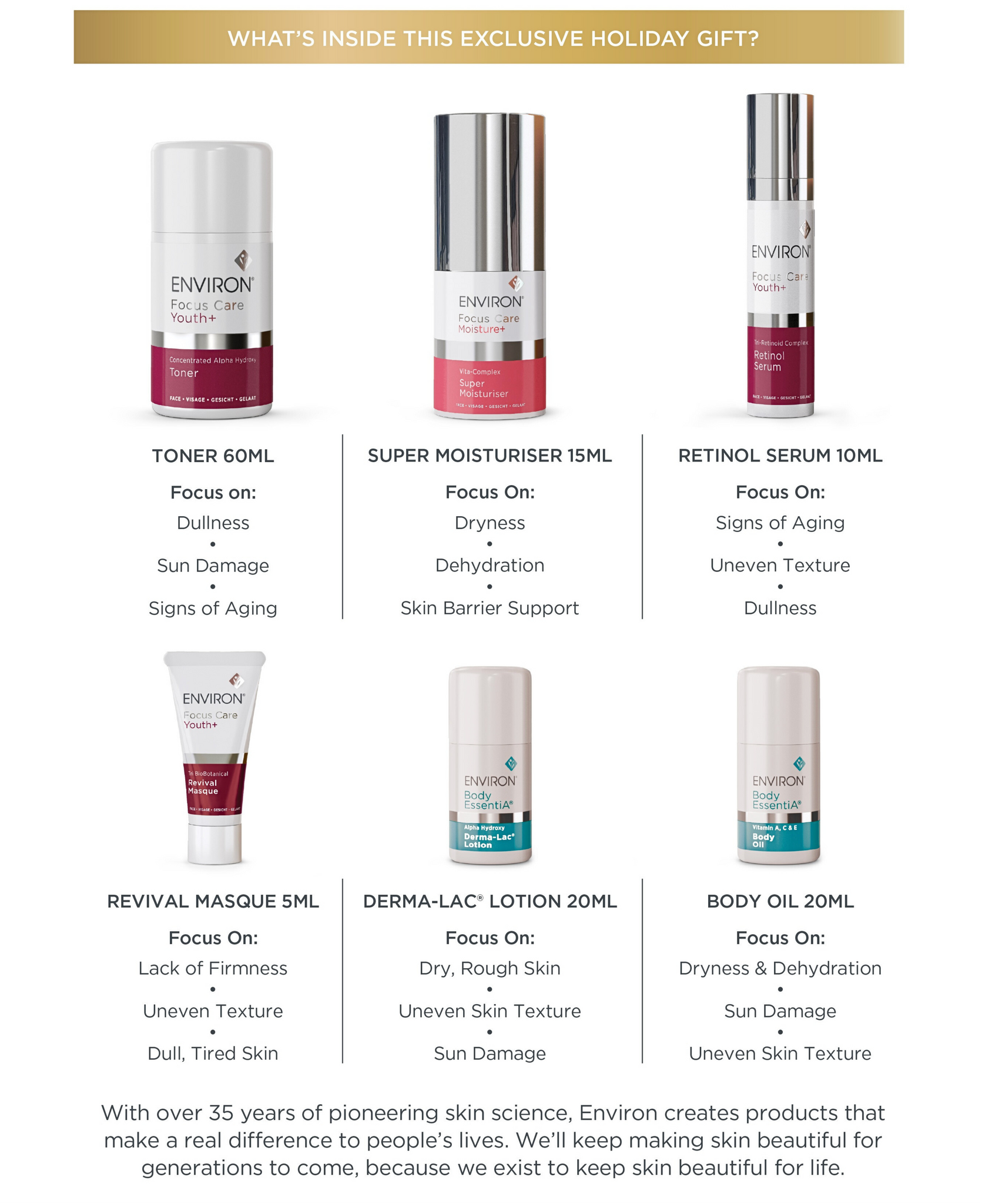 6 award-winning skincare essentials with the purchase of Environ products. This set is a gift with purchase of Environ products, one of which must be a vitamin A moisturizer.